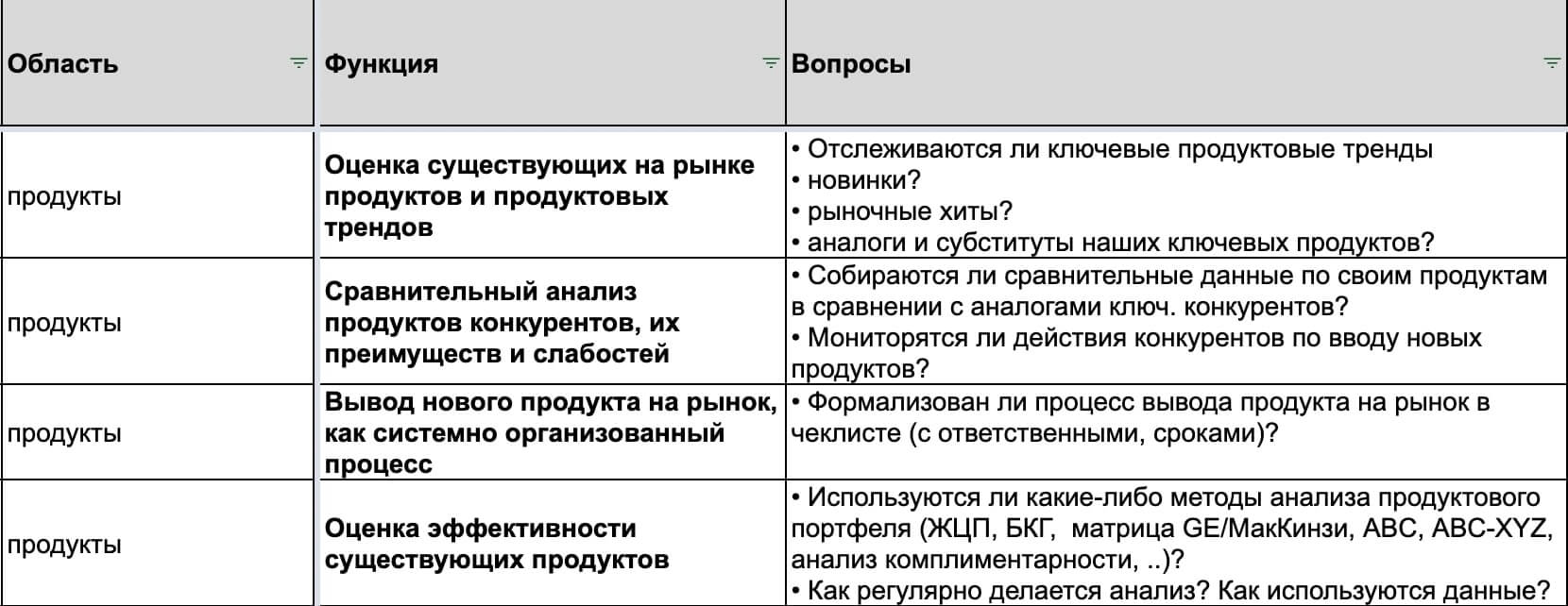 - Карта аудита бизнес-процессов. Мы проводим анализ по 30+ маркетинговым функциям/процессам, которые должны работать в компании с такой моделью.