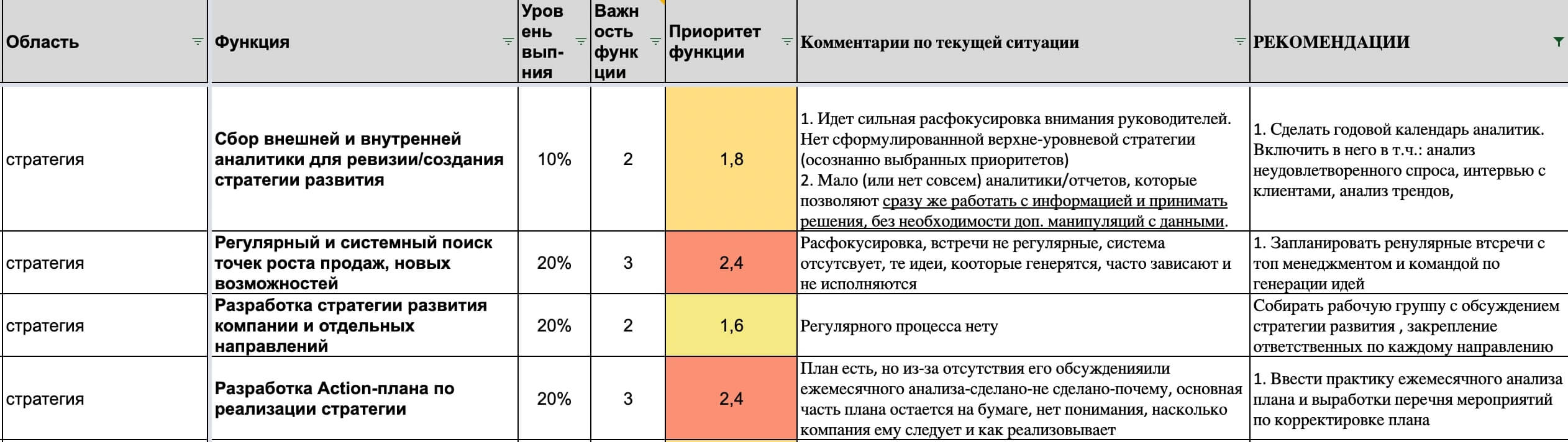 Пример развернутого отчета маркетингового аудита по каждой области и функции, отчет содержит комментарии по текущей ситуации и набор рекомендаций.