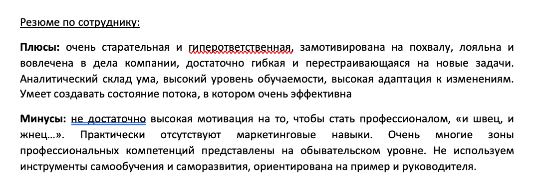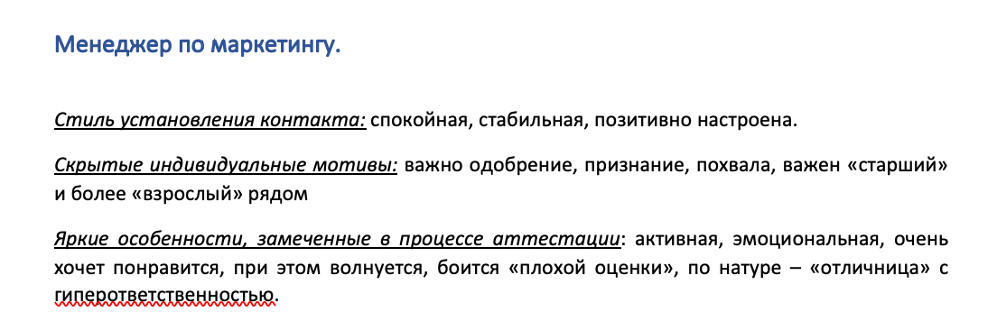 По результатам интервью формируется резюме с описанием сильных и слабых сторон и набором рекомендаций.