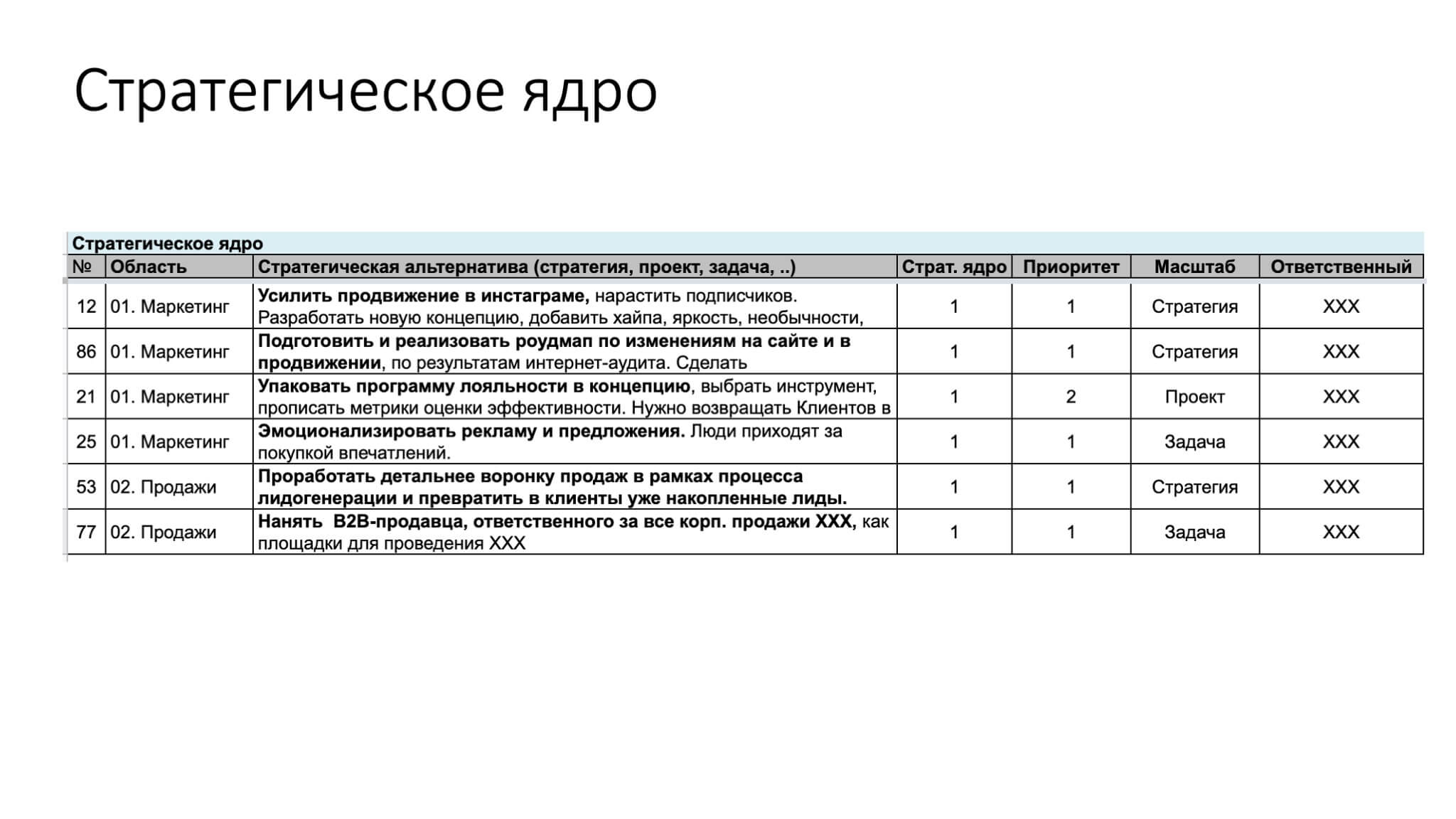 Это план-график в формате диаграммы Ганта по реализации вашей стратегии роста и трансформации бизнес-модели. Он позволяет нам передать персональную ответственность за проекты развития вашим сотрудникам.