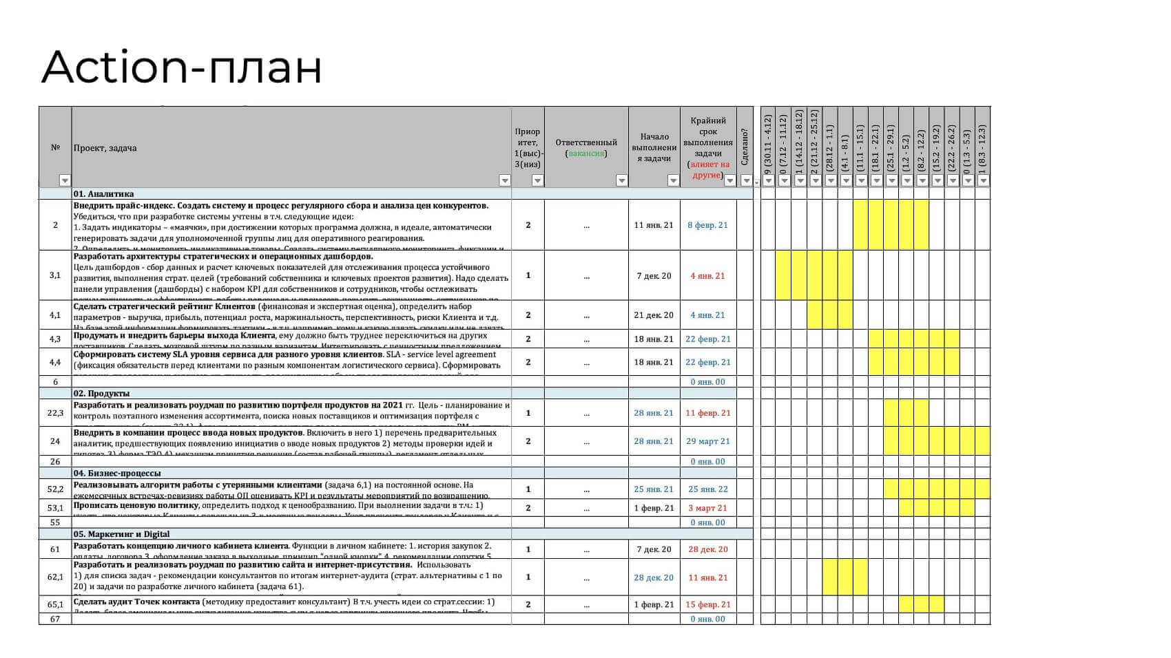 Action-план создается на базе принятой стратегии и страт. ядра. План-график содержит описание каждой задачи/проекта, ответственного, сроки реализации, приоритет среди других задач плана. Задачи и проекты связаны между собой в цепочки — это позволяет видеть критический путь проекта (ту последовательность задач, которая отвечает за длину проекта.